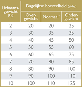 Het dagelijks rantsoen is gebaseerd op het huidige gewicht van de kat en moet maandelijks worden aangepast. Zorg altijd voor een ruime hoeveelheid vers drinkwater.