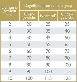 De dagelijkse hoeveelheid is gebaseerd op het huidige gewicht van de kat en moet maandelijks worden aangepast. Zorg altijd voor een ruime hoeveelheid vers drinkwater.