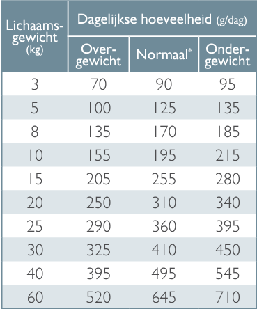 Het dagelijkse rantsoen is gebaseerd op het HUIDIGE gewicht van de hond en moet maandelijks worden aangepast. Zorg altijd dat er voldoende vers drinkwater beschikbaar is.